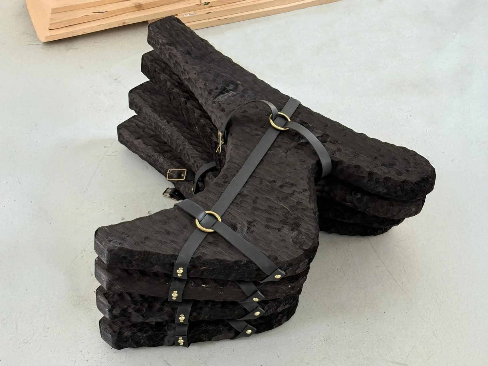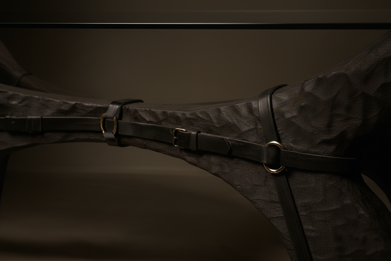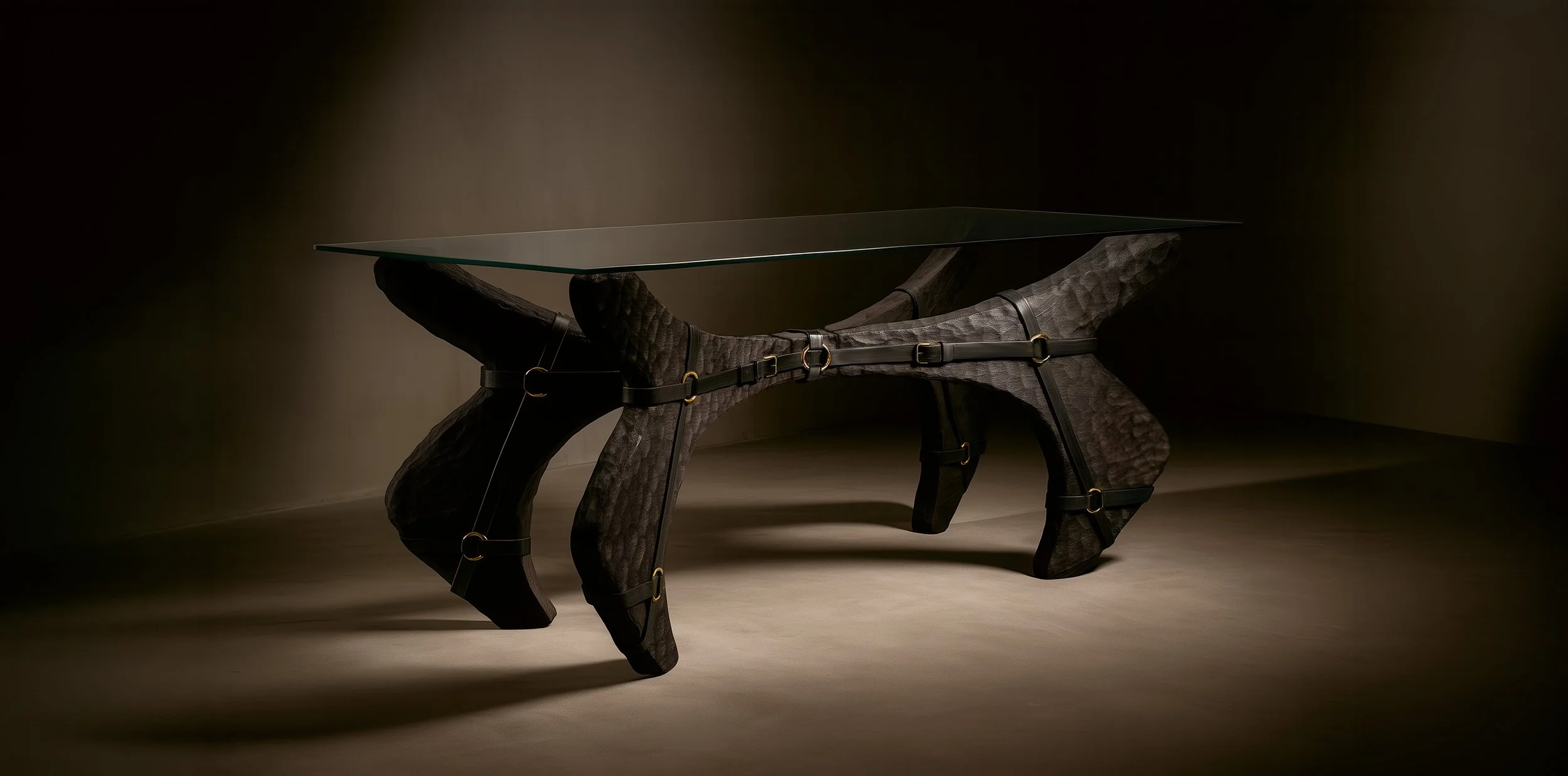 Ashes and Rubber Desk is a sculptural desk where charred wood forms a tense, architectural base, bound by rubber straps that recall restraint, repair, and endurance. The burnt surface carries the memory of fire, while the glass top introduces a precise, almost weightless counterpoint. Suspended between destruction and control, the piece transforms raw remnants into a functional object, balancing fragility, strength, and quiet authority.