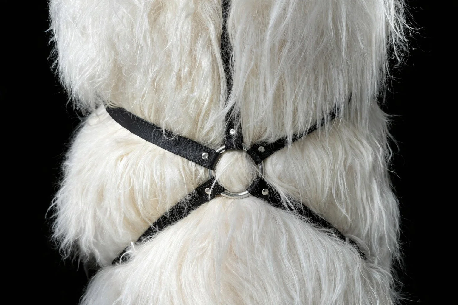 A vertical body of pale fur, bound by dark harnesses, hangs in silence like a restrained instinct. The material invites touch, almost comfort, while the straps impose control, structure, and constraint.