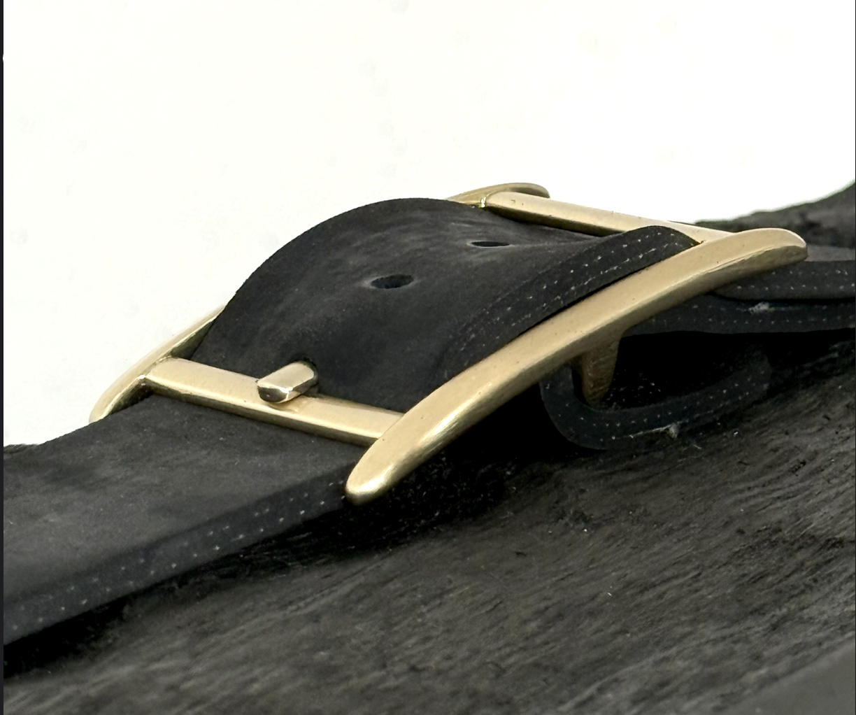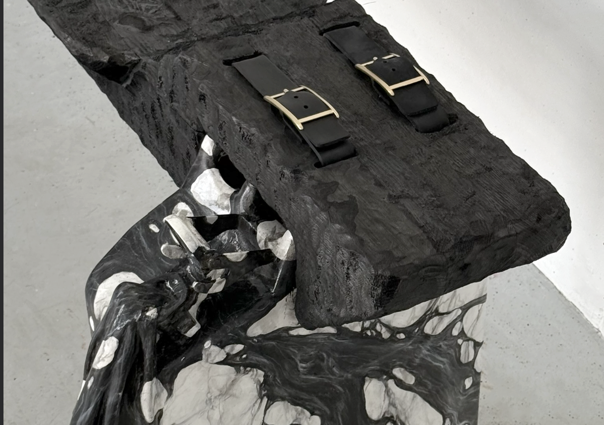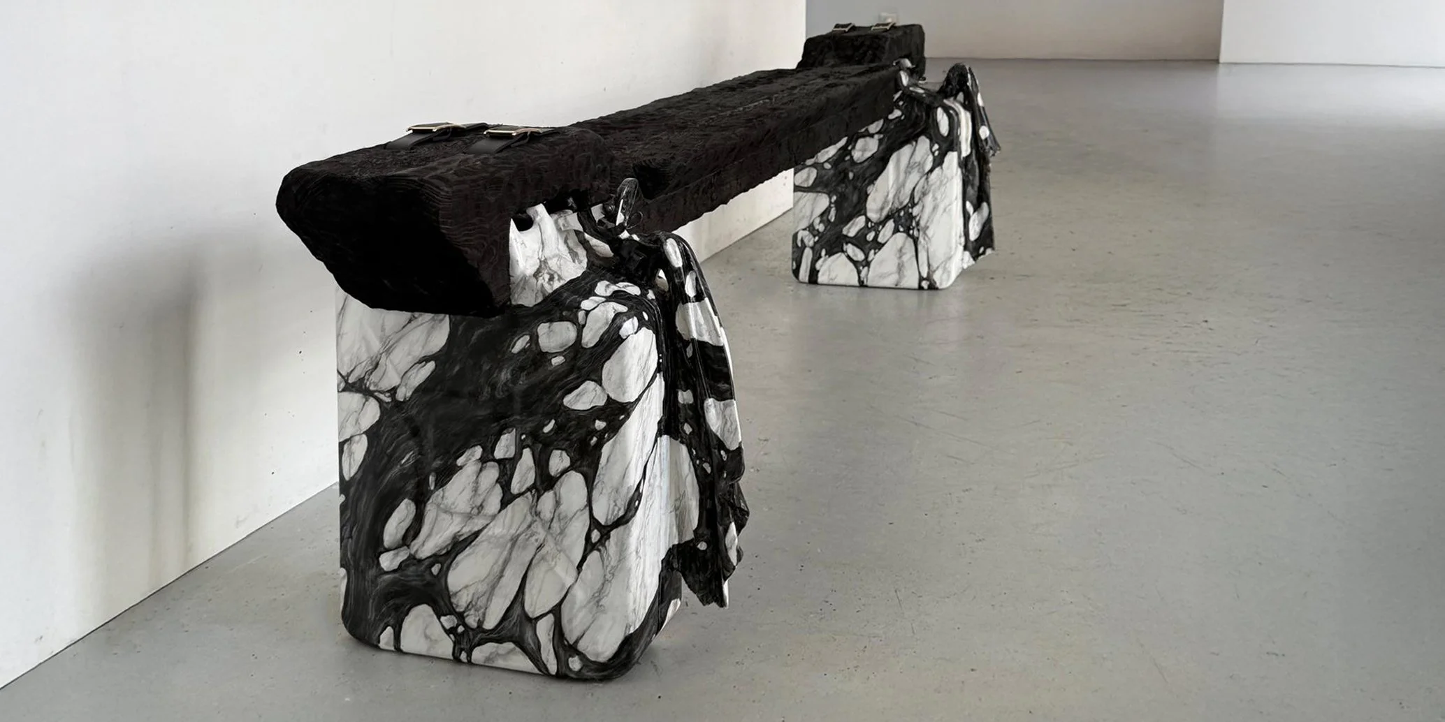Charred wood, black-and-white veined mineral blocks, and industrial straps are held in tension, forming an object that is both functional and sculptural.