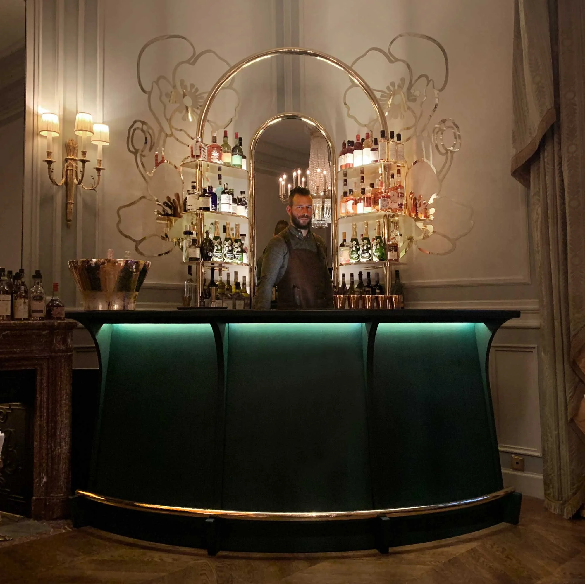 This bespoke creation merges the sophistication of Parisian interiors with the poetic spirit of nature. Every detail, from the curved counter to the mirrored arch, was conceived to elevate the act of serving champagne into a moment of theatre and grace.