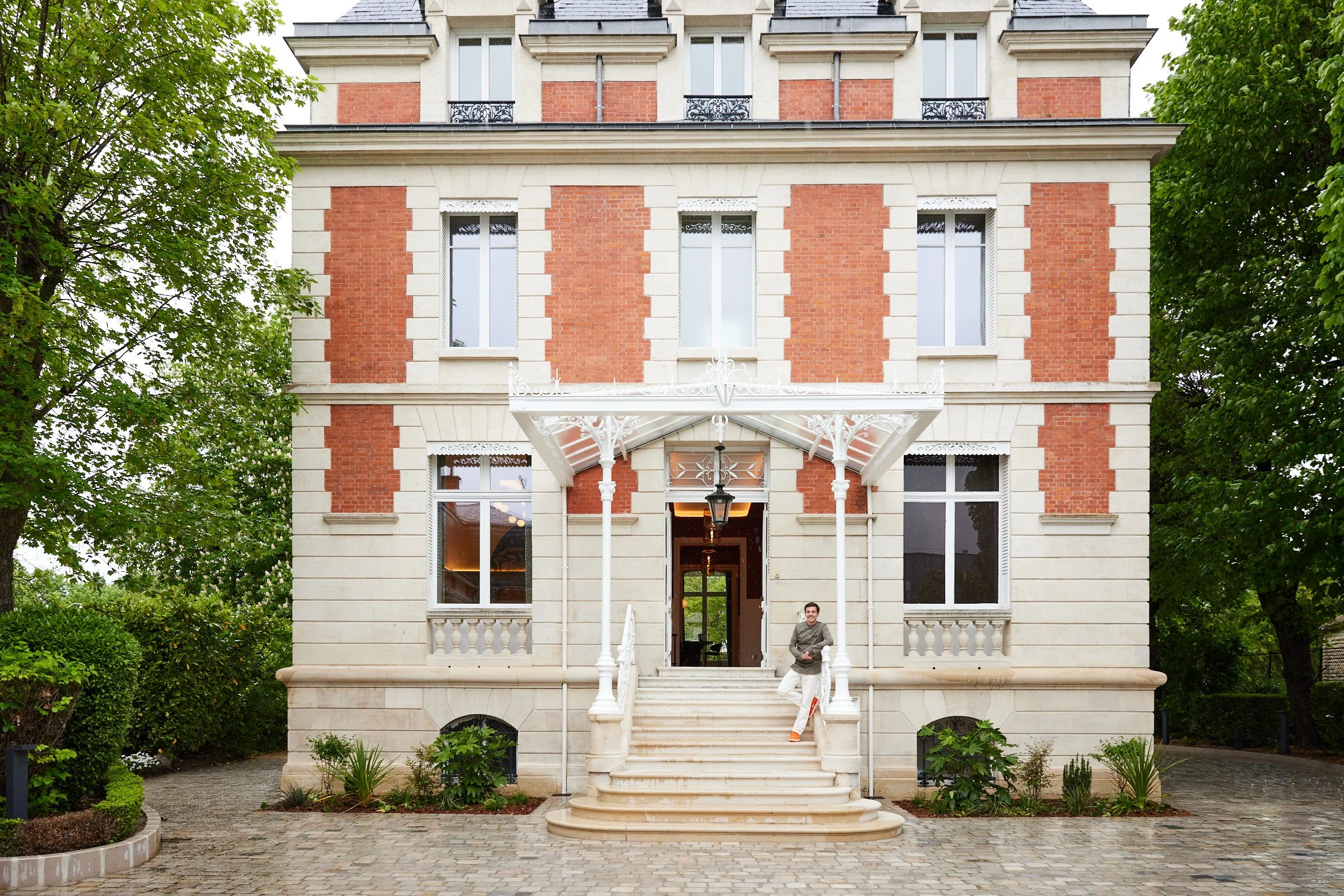 The renovation preserves the timeless elegance of the 19th-century townhouse while introducing a modern dialogue through color, texture, and light. Inside, soft wall paneling and bespoke lighting highlight a mural panorama evoking the landscapes of Champagne, while velvet seating in deep green and vermilion tones adds warmth and intimacy.
