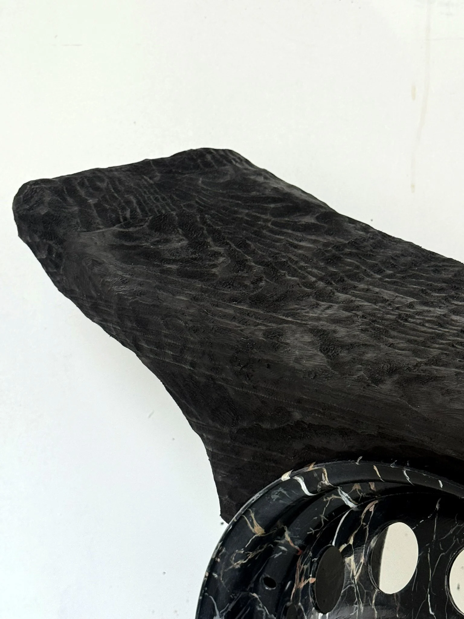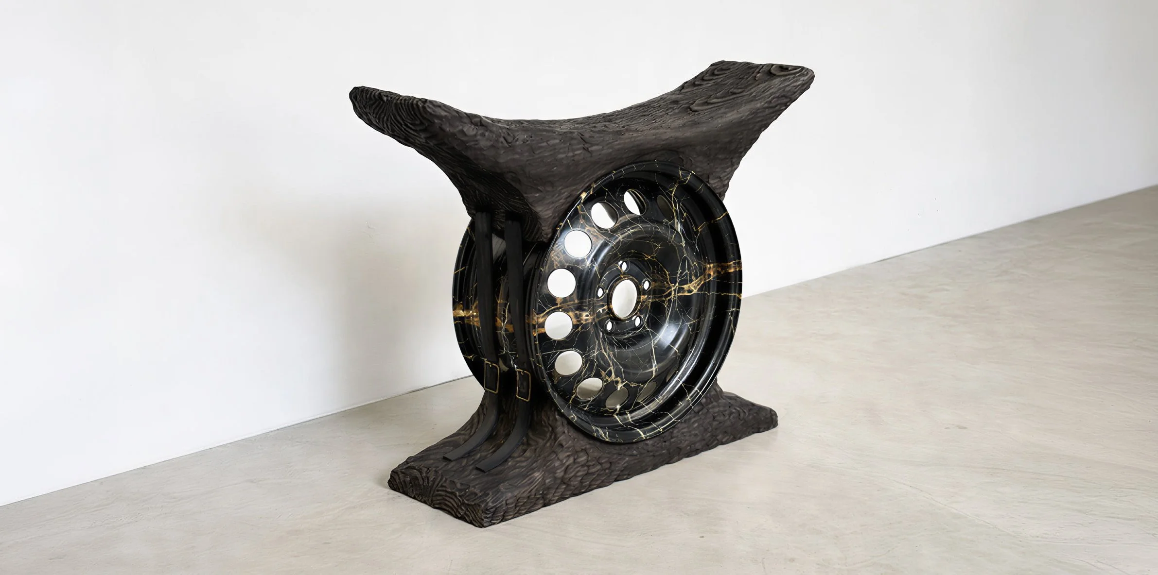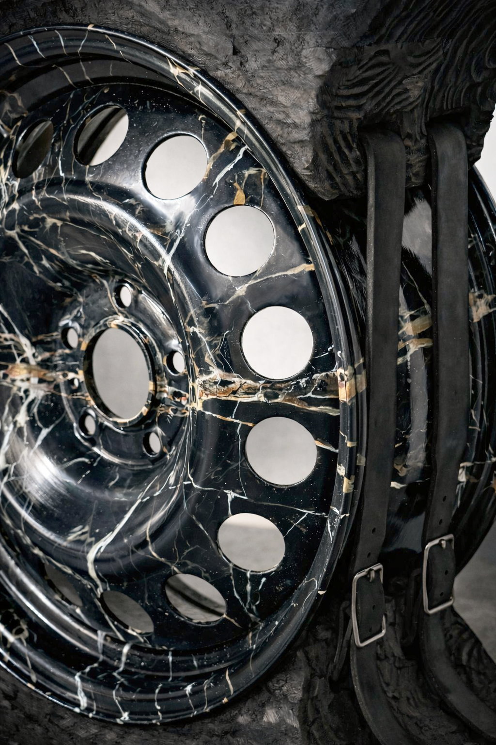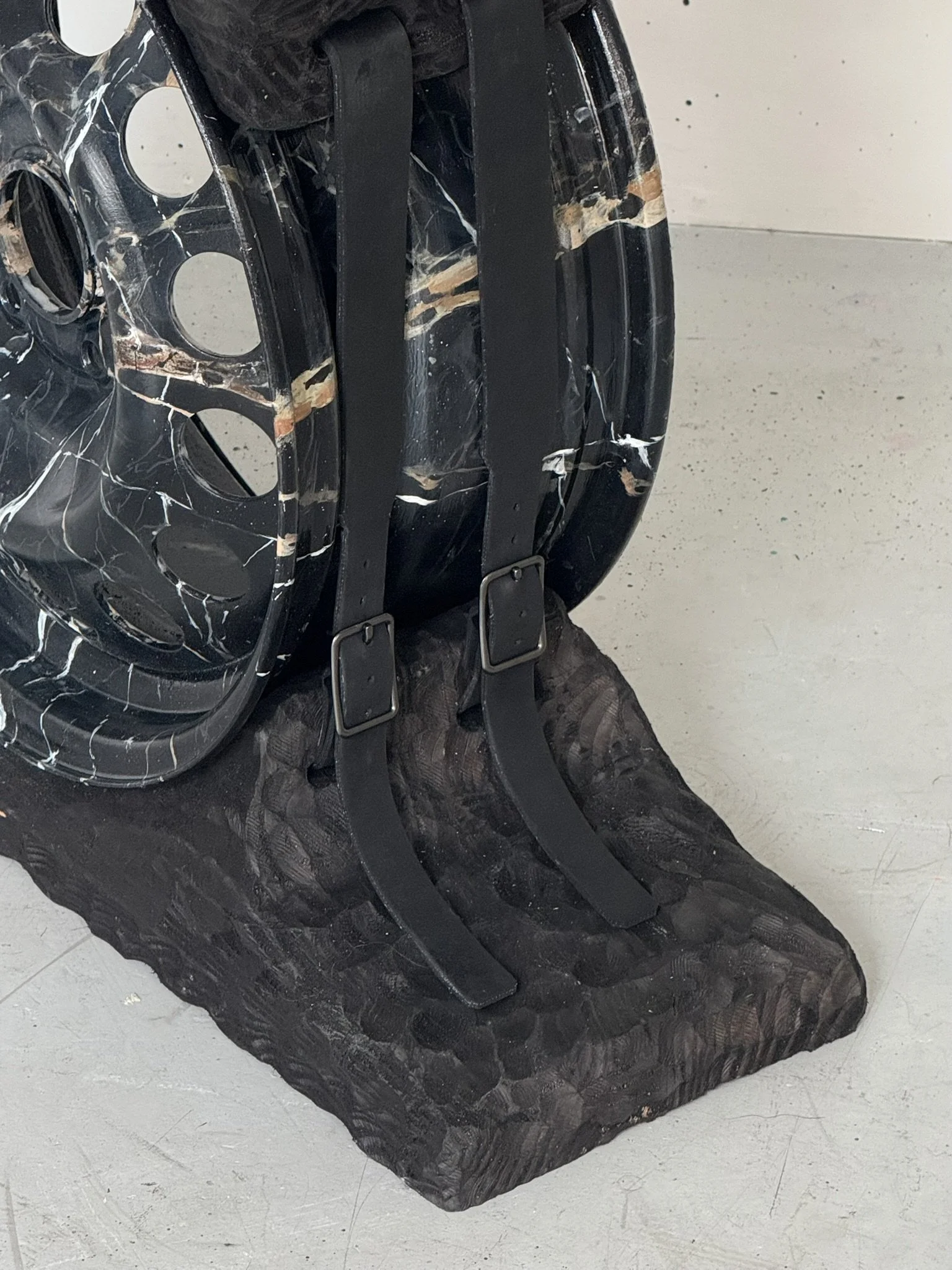 L'objet tient ensemble deux logiques opposées : la permanence minérale du marbre et la fragilité organique du bois brûlé, le mouvement potentiel de la roue et l'immobilité imposée par les sangles. Fonctionnel ou rituel, meuble ou sculpture. Wheel of Fortune résiste à la classification, comme le hasard lui-même.