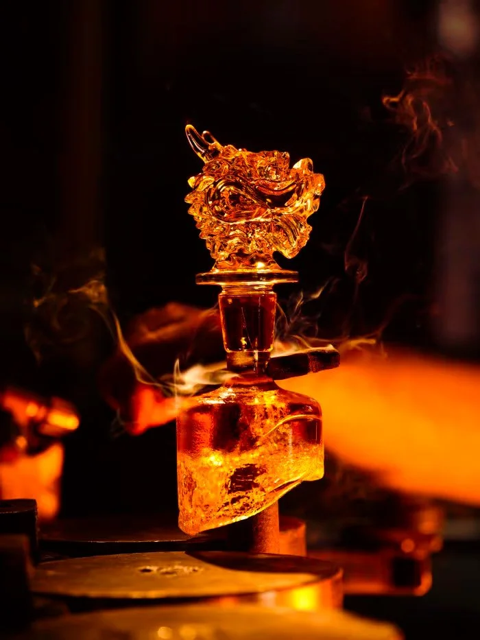 La Maison Martell a collaboré avec Baccarat, pour créer une pièce somptueuse et élégante : une carafe en cristal évoquant une goutte unique et pure de cognac, qui rehausse la richesse et le raffinement de l’assemblage qu’elle renferme. Son col orné d’or 19 carats est gravé, tandis qu’elle est coiffée d’une tête majestueuse tête de dragon, une pièce unique et d’une perfection rare.<br>Les carafes sont créées en quantités extrêmement limitées, Moins de 750 exemplaires, chacun numéroté individuellement.